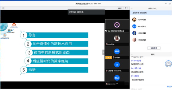 讲座最后,北航MEM中心主任闪四清教授再次对欧阳日辉教授百忙之中抽出时间授课表示感谢,并简要介绍了2019级北航MEM近期学习计划安排,并叮嘱同学们疫情期间多多注意安全,并送上健康祝福。同学们纷纷在会议聊天室中表达对欧阳日辉教授、闪四清教授的衷心感谢,表示通过此次讲座对疫情中数字经济的新业态、新模式、新产业有了进一步了解,这对同学们毕业论文选题以及就业创业都有了更多新启发。